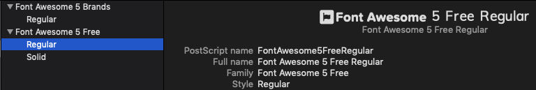 Easy enough right? Wrong. When you download Font Awesome the .ttf files for solid and regular use the SAME Family name. On macOS you can easily see this by opening the “Font Book” app, and importing the Font Awesome .ttf files. If you click on the font name, then the ‘i’ icon, you can see the value of Family: